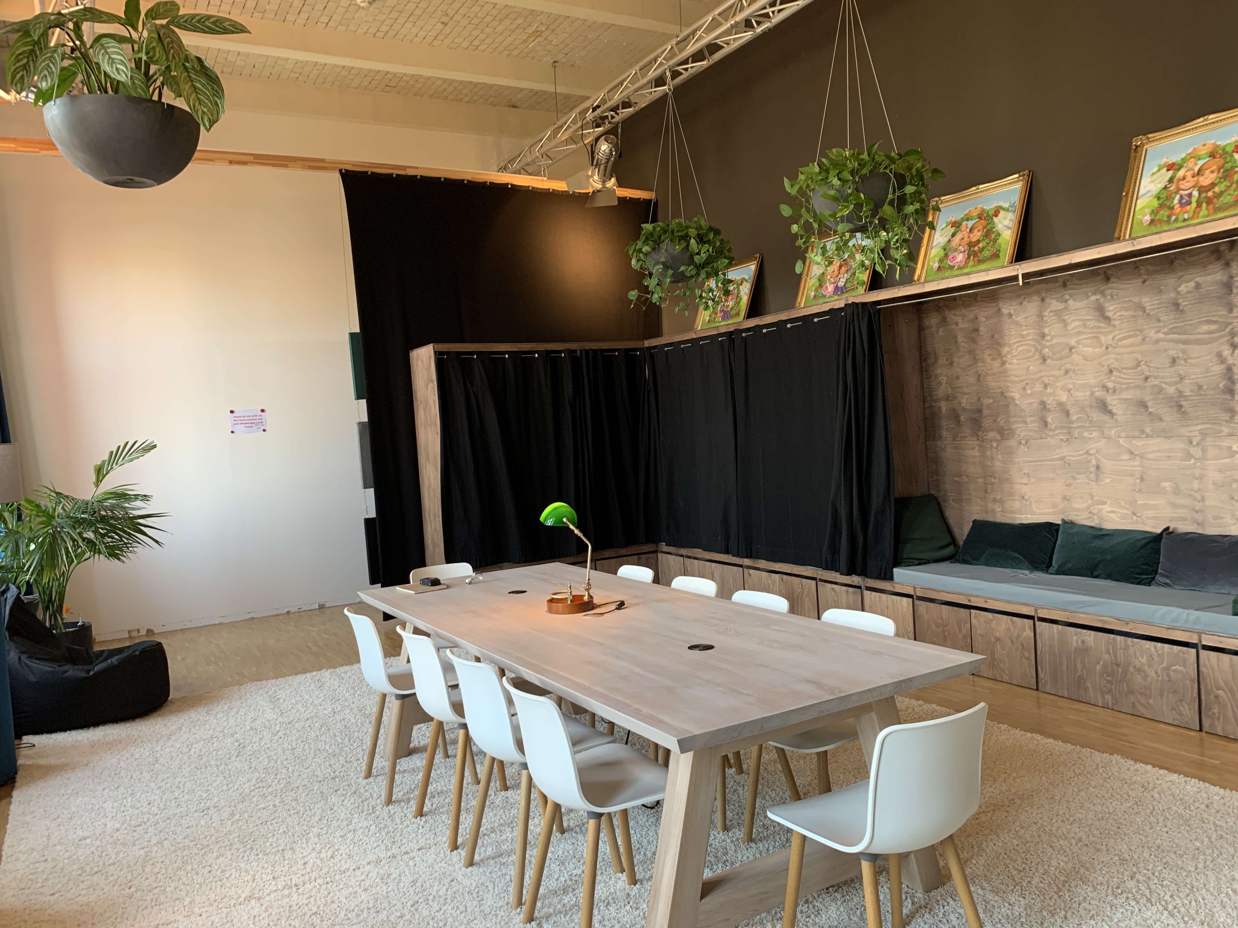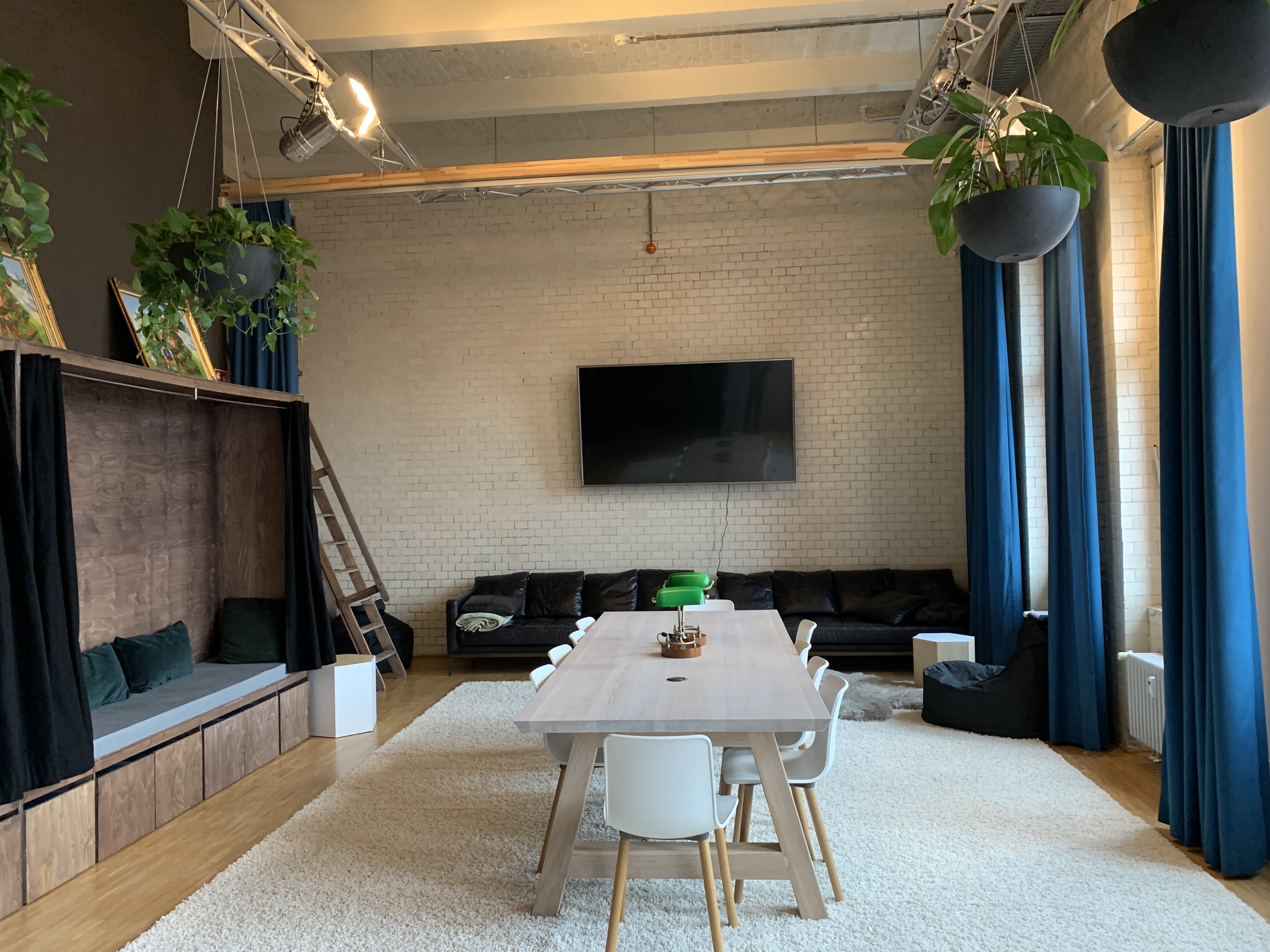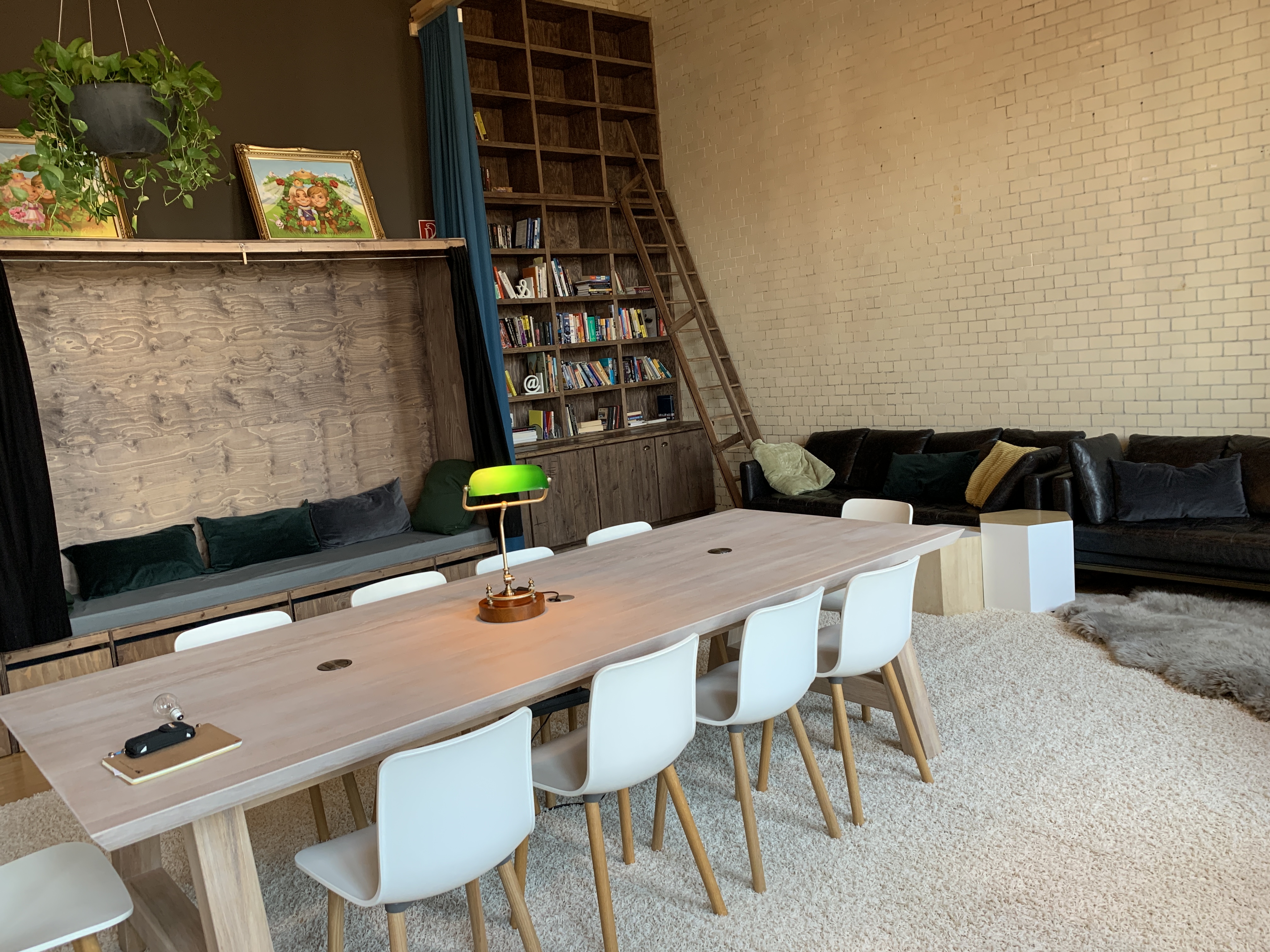 Eine ungenutzte Ecke. Ein weißes Blatt. Kulisse für Shootings. Die Library vereint, was selten zusammenkommt: konzentriertes Arbeiten, crossfunktionale Meetings und akustische Ruhe in einem Raum, der sich anfühlt wie eine Entdeckung. Das 4-Meter-Maßregal, die upcycelte Vintage-Leiter aus den 1960ern, der handgefertigte Buchenholz-Konferenztisch mit versenkbaren Steckdosen – jedes Detail erzählt. Vorhänge teilen den Raum flexibel in Silent Workspace und Leseecke. Den Eingang markiert eine restaurierte Berliner Altbautür. Doppelflüglig. Unverkennbar.