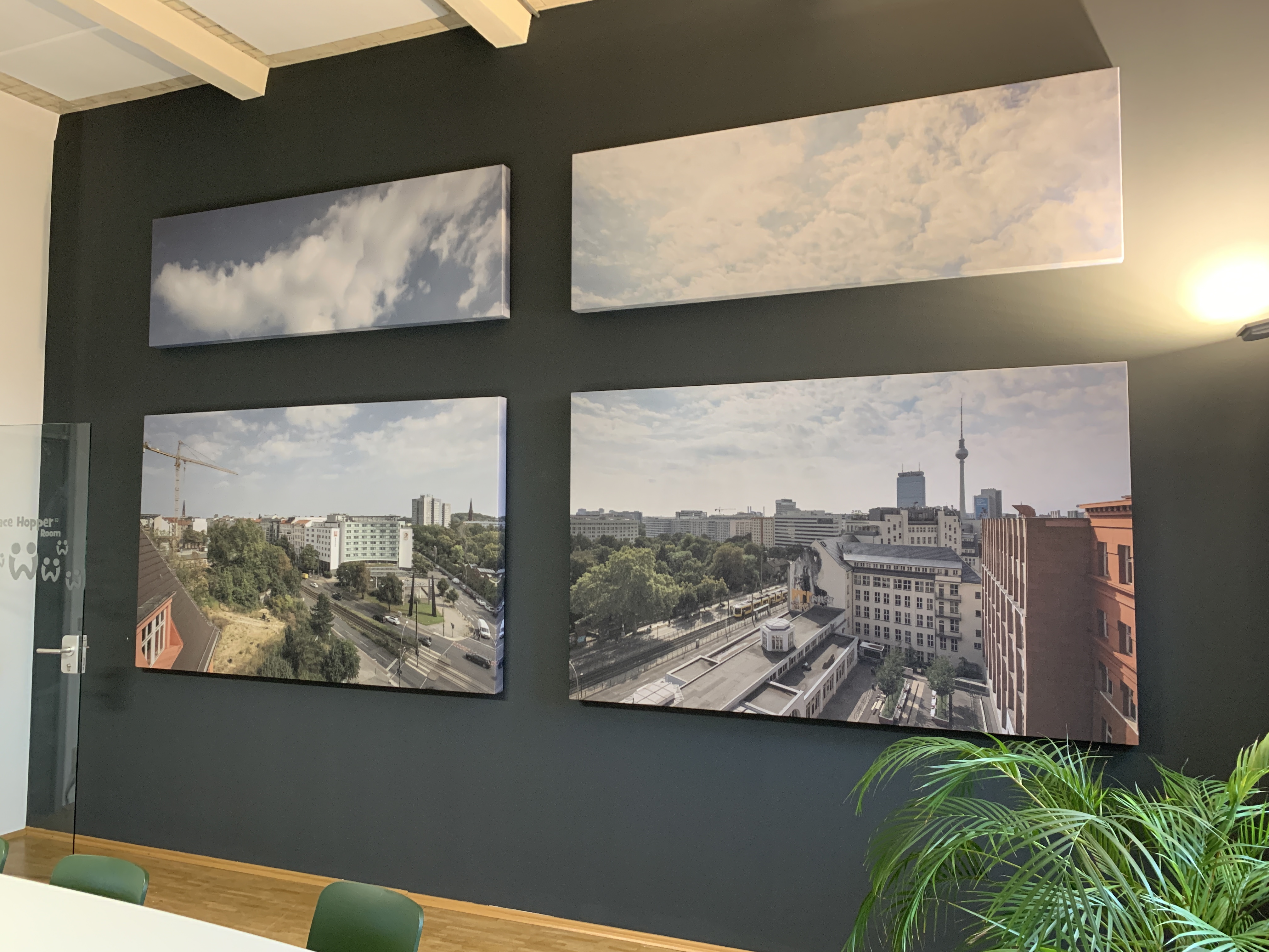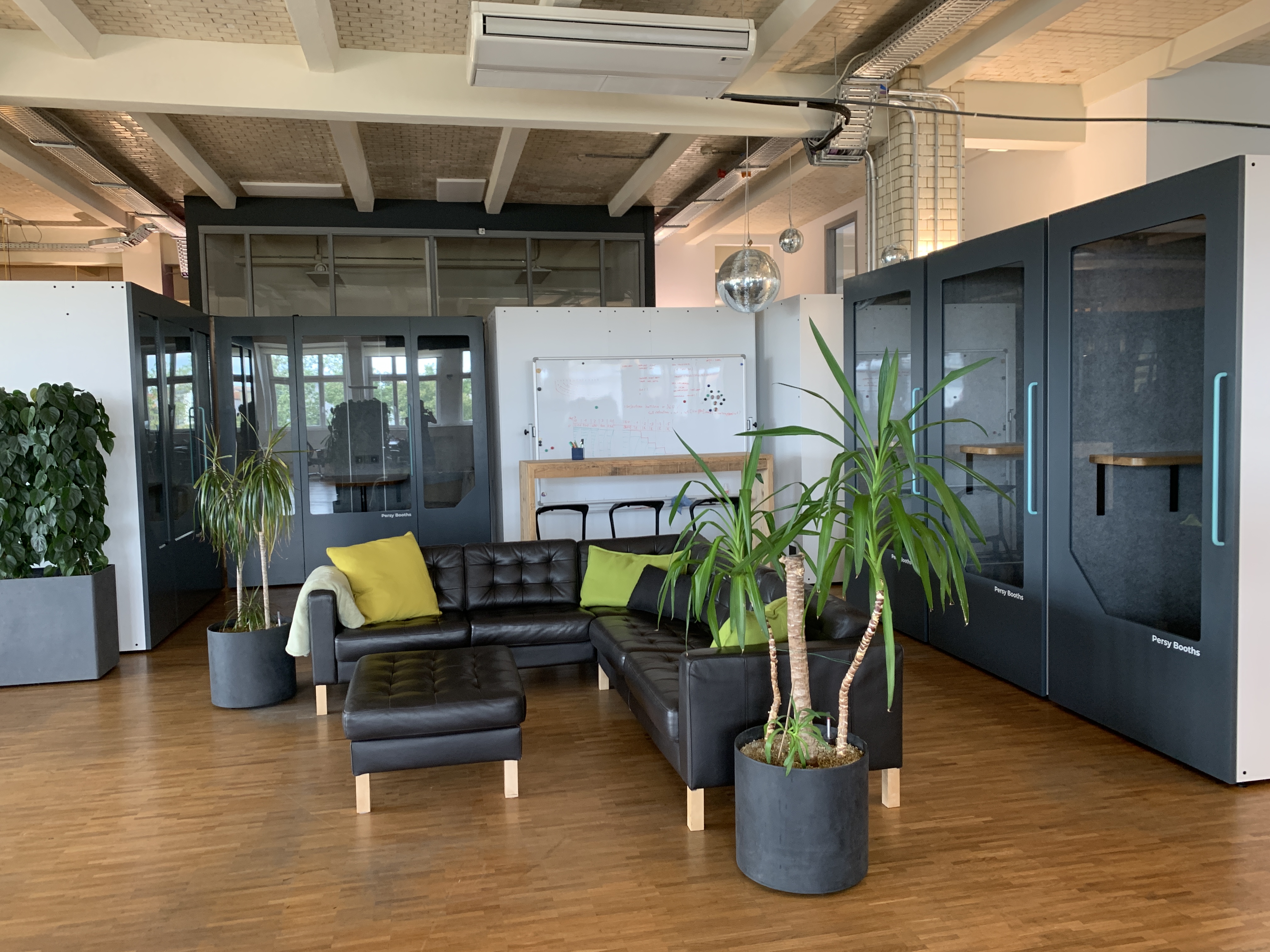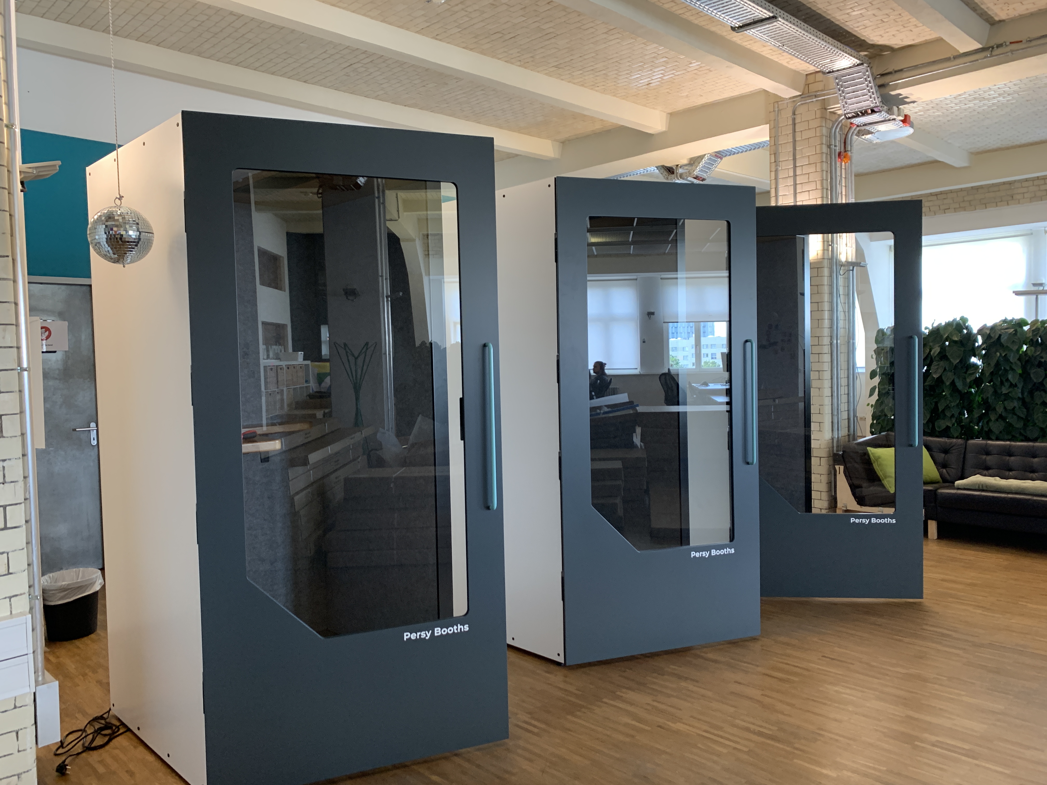 Denkmalgeschützte Kacheldecken sind schön – aber akustisch eine Herausforderung. In den Meetingräumen der Backfabrik war Konzentration kaum möglich. Die Akustikpaneele wurden von Neulant van Exel gebaut. Für das Motiv haben wir uns das wunderschöne Panorama von der Dachterrasse mit Blick auf den Fernsehturm vorgestellt. Für den Shoot kam eine Canon EOS-1D zum Einsatz – eine Kamera, die man nicht für ein gewöhnliches Büroprojekt auspackt. Der Raum gewann nicht nur an akustischer Qualität – er bekam eine Tiefe, die jeden Blick auf den Konferenztisch zum Blick in die Weite machte. Der nächste Schritt im Großraumbüro: Phonebooths von Persy Booths, einem Berliner Startup. Customizable, funktional – damit jede und jeder, ob im Deep Work oder im vertraulichen Call, seinen Platz findet.