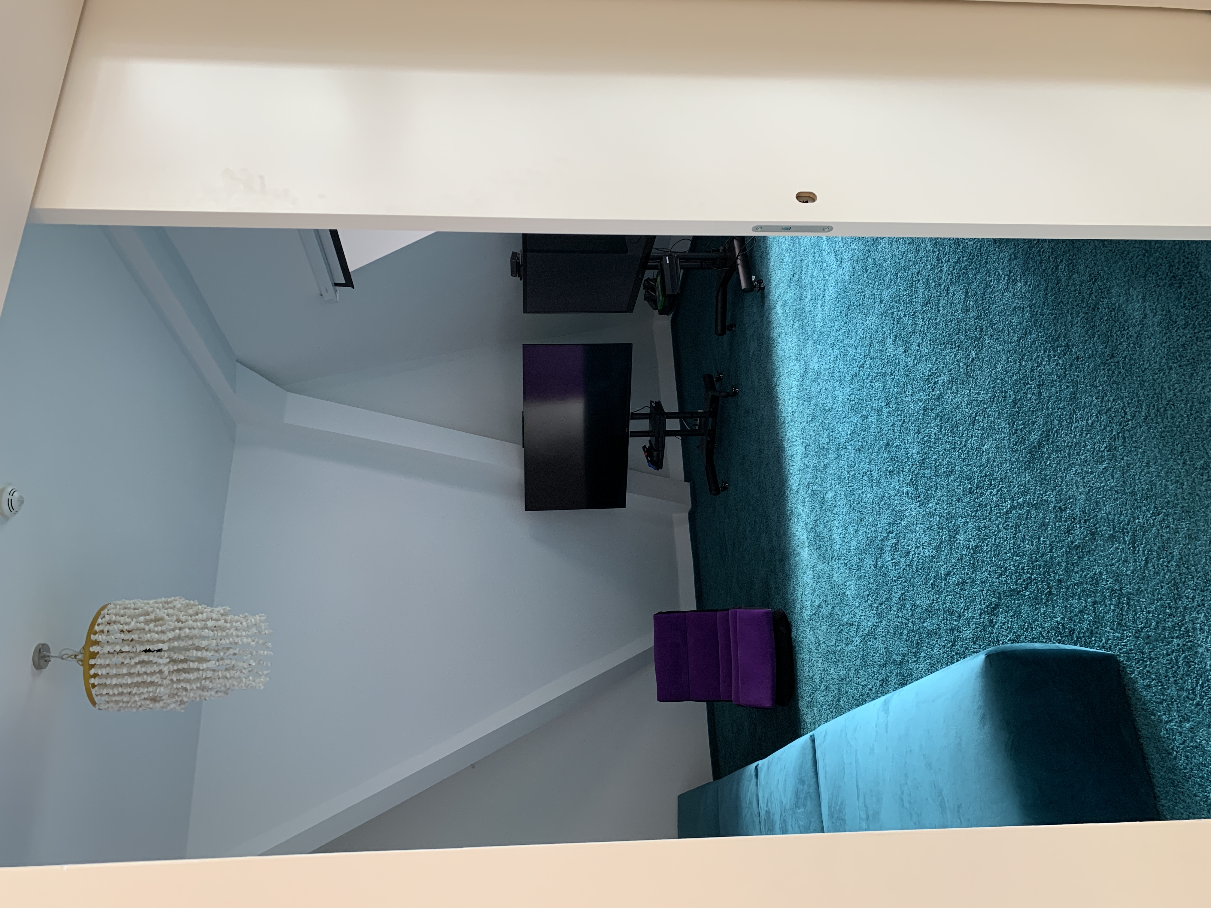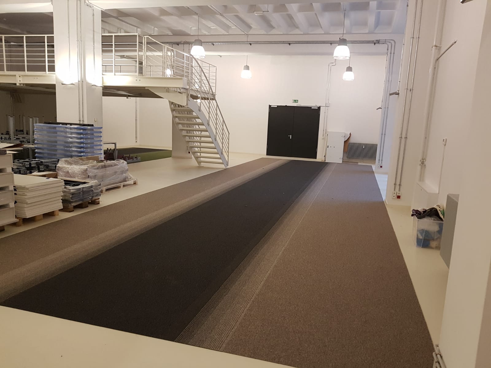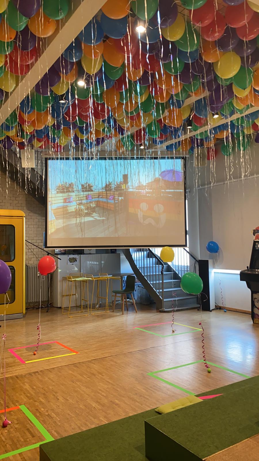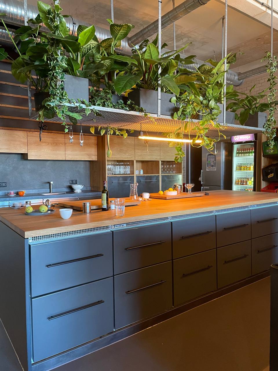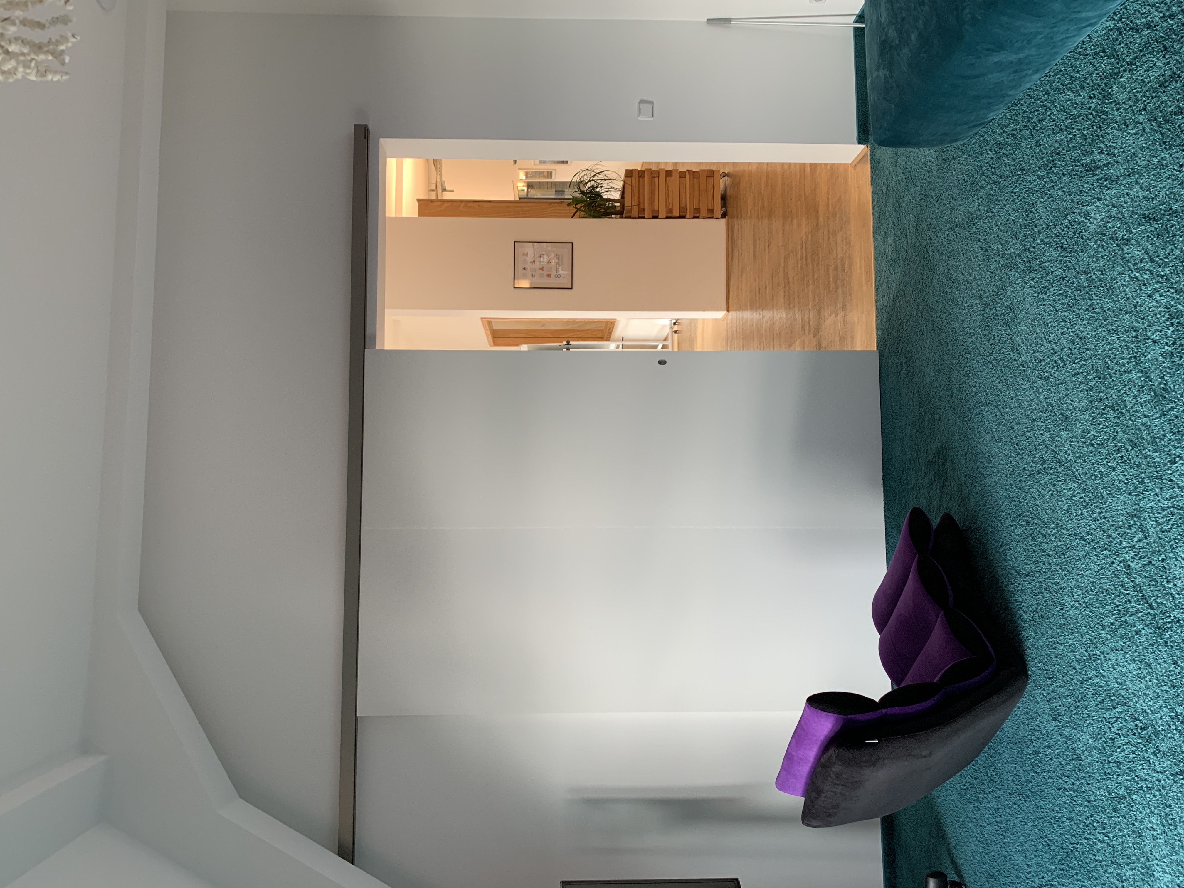 Früher ein Durchgang – Fahrräder, alte Möbel, verlorener Raum. Heute: ein Ort für Game Nights, Yoga, Teamgespräche und alles dazwischen. Eine große Schiebetür verwandelte den Raum. Der Teppich ist ökologisch unbedenklich, schallabsorbierend und Bfl-s1 zertifiziert – Akustik, die man hört. Oder eben nicht. Direkter Zugang zur Dachterrasse, Beamer, große Leinwand. Und ausreichend Platz fürs Zocken. Geplant und umgesetzt unter Einhaltung aller Brandschutzanforderungen.